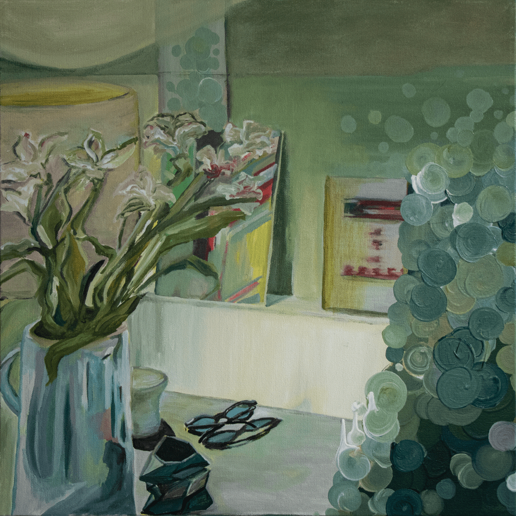 a pitcher of my favorite flowers, the 3d model my brother helped me print, my great grandfather’s poetry book, and two abstract paintings from last year